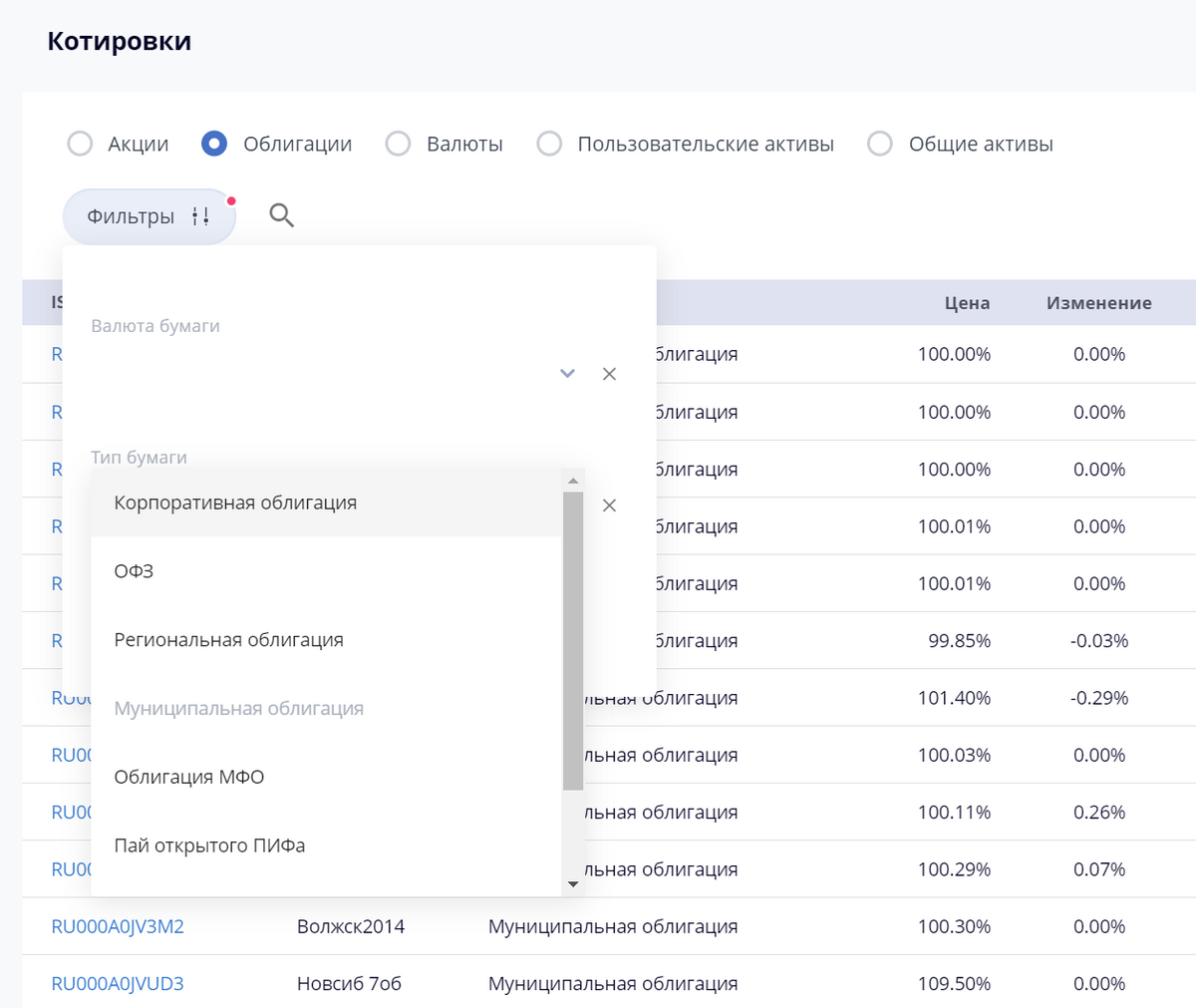 Облигации, по типу, теперь вы легко сможете найти и отфильтровать нужную вам бумагу.