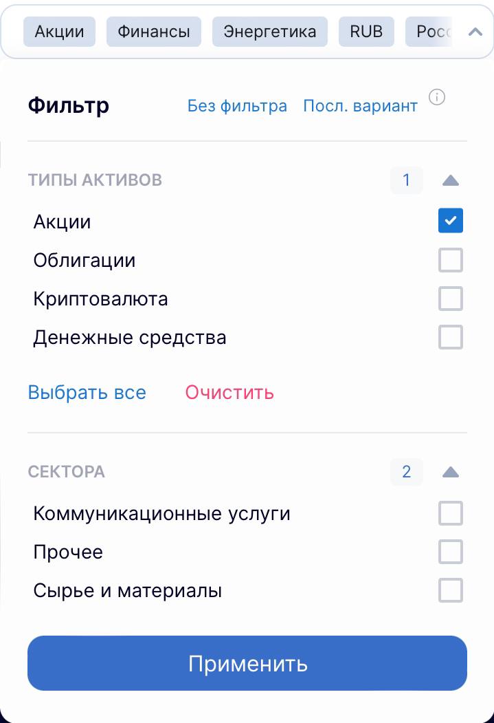 📝 Теперь все сделки можно отсортировать по типу активов (акции, криптовалюты, денежные средства и т.д.), а также по секторам, валюте, странам, тегам или выбрать отдельные бумаги.