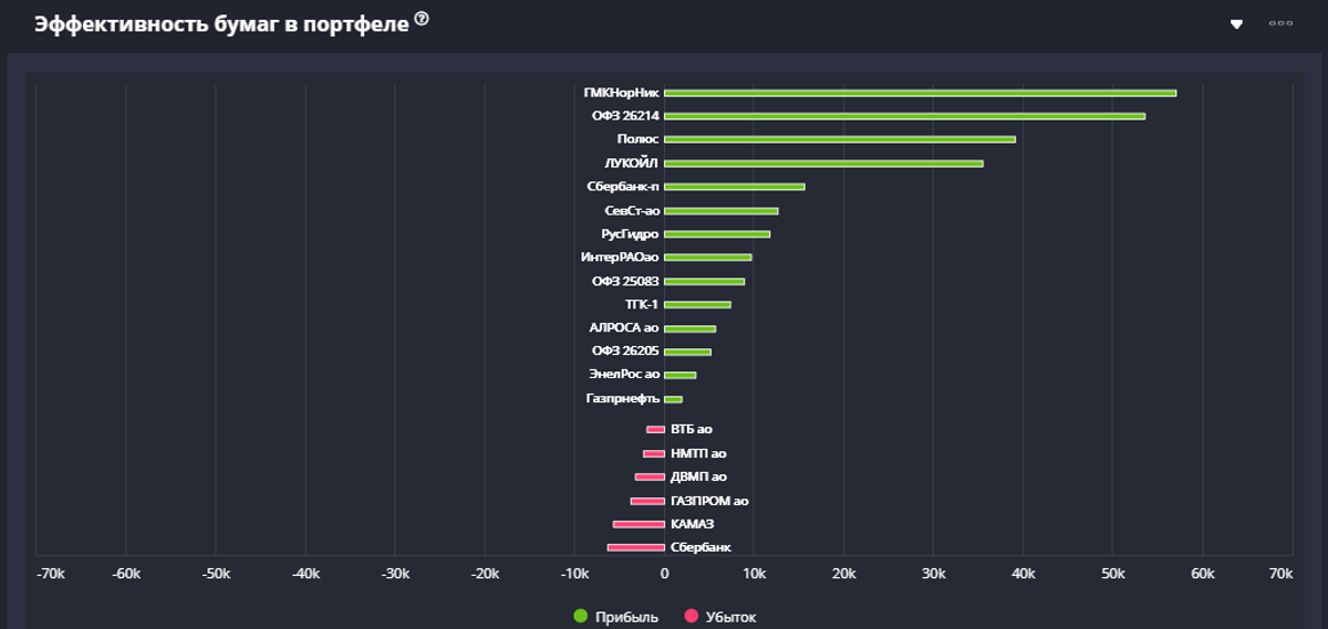В разделе "Аналитика" обновили график эффективности, что отражает через столбчатую диаграмму эффект прибыли каждого отдельного актива. Вам стоит обратить на него внимание, потому что он не круговой! При наведении отражается суммарная прибыль и доходность.