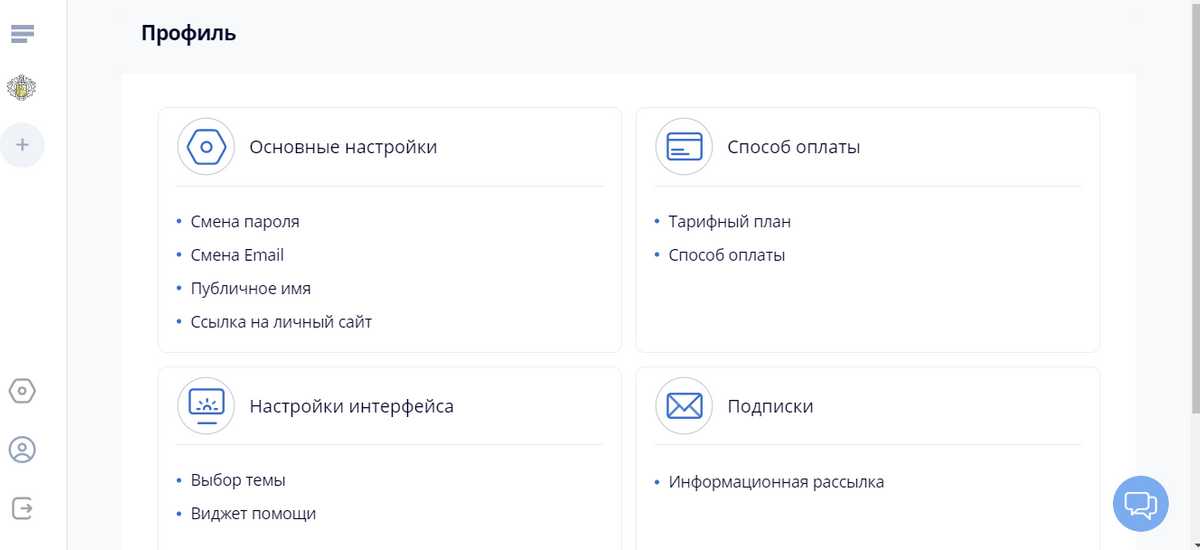 - Настройки (смена имени или пароля, информация о текущем тарифе и способе оплаты).
